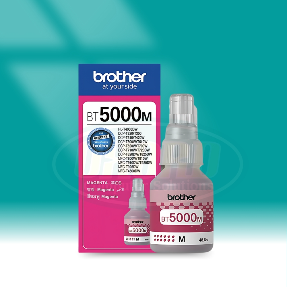 The Brother BT5000 Magenta Ink Bottle supplies vivid magenta dye ink for bold color prints. This 48.8ml original-level compatible bottle refills Brother Ink Tank printers smoothly and accurately.